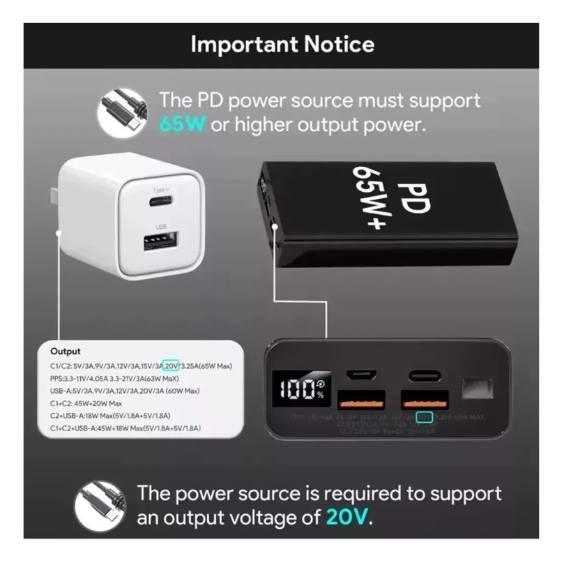 ❌ Powerbanks fracos – Exigido mínimo de 65W com PD 20V (confira o seu!).